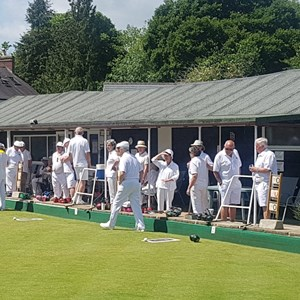 The time came for us all to make our way to the bowling club. It was behind a high fence at the end of the village car park. We were welcomed in by one of the Brockenhurst members who had finished cutting the green only 20 minutes before!